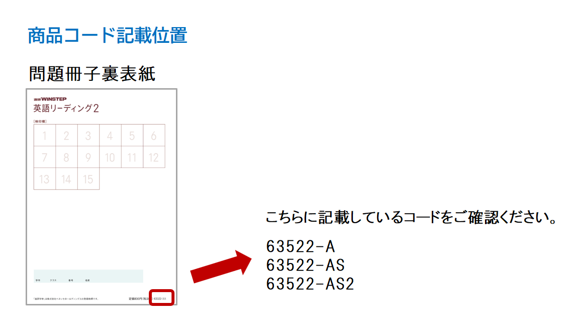 進研WINSTEP 英語リーディング2をご採用いただいた先生方にご利用いただけるダウンロードコンテンツです。本教材は2025年10月31日以降の出荷商品においてダウンロード付録のご提供内容が一部異なります。お手数をおかけしますが、ご購入いただいた教材に記載の商品コード(問題冊子裏表紙の右下に記載のあるコード)をご確認いただき、商品コードにあったダウンロード付録ページへアクセスいただけますと幸いです。