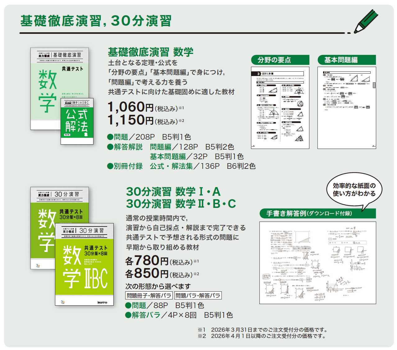 『共通テスト対策【実力養成】シリーズ』(数学)は、大学入試をめざす生徒のための共通テスト対策問題集です。分野別に基礎の定着から思考力を養成する「重要問題演習数学」、「基礎徹底演習数学」と、共通テストの出題形式に合わせて思考力を養成する「30分演習数学I・A」「30分演習数学Ⅱ・B・C 」で構成されます。